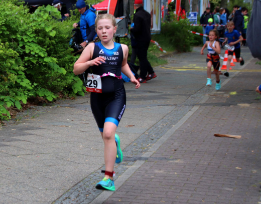 Ganz zum Schluss, bei den Schülerinnen A, hatten wir wieder Grund zum Jubeln, denn mit Nia Berner konnten wir erneut eine Siegerin stellen. Sie glänzte vor allem beim Schwimmen und beim Radfahren, wobei Sie beim Radfahren das Glück hatte, in einer sehr guten Radgruppe mit der Jugend B zusammen zu fahren. Elisa Lehmann, leicht angeschlagen gestartet, wusste ebenfalls erneut zu überzeugen und belegte den Podiumsplatz 3. Unserer jüngerer Jahrgang in dieser AK konnte das sehr gute Ergebnis untermauern und so belegten Mia Fehrmann Platz 4, Frieda Gest Platz 6 und Lia Lotta Schultz Platz 7; also alles Top Ten Platzierungen.