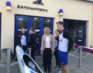 Neben den wichtigen Informationen zu den Bundesstützpunkte, kam Frau Ministerin Hesse auch mit den jungen Sportlerinnen und Sportlern bzw. deren Trainerinnen und Trainern ins Gespräch. Neben Problemen und Wünschen ließ sich die Ministerin auch kurz die Kniffe beim Kajakfahren erklären.