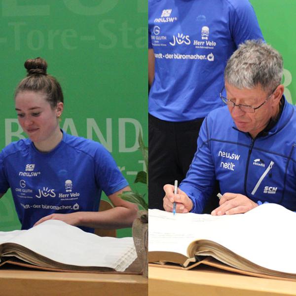 Im Anschluss an die Siegerehrung des Laufes gab es in diesem Jahr noch ein besondere Ehrung seitens der Stadt. Oberbürgermeister Silvio Witt bat Lena Meißner und Frank Heimerdinger vom SC Neubrandenburg, sich in das Ehrenbuch der Stadt Neubrandenburg einzutragen. Lena ist seit vielen Jahren erfolgreiches Aushängeschild der Neubrandenburger Triathleten und konnte in diesem Jahr mit dem Vizeeuropameistertitel über die Sprintdistanz, sowie Platz 3 im WM Finalrennen in Abu Dhabi vor 5 Wochen ihre bisher beste Saison in der Eliteklasse des Triathlons erreichen.