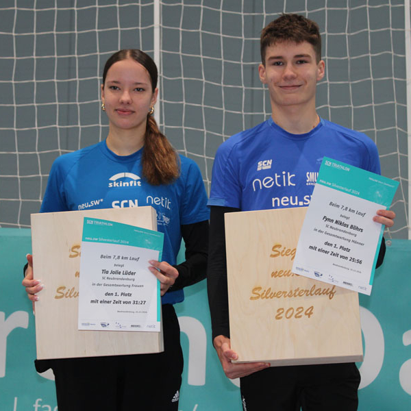 Tia Jolie Lüder und Fynn Niklas Böhrs von den veranstaltenden Triathleten des SC Neubrandenburg haben bei guten äußeren Bedingungen den 15.neu.sw Silvesterlauf 2024 über 7,8km gewonnen. Bei den Damen folgten die erst 13-jährigen Polly Vierhufe und Elise Glöckl auf den Plätzen 2 und 3 der Gesamtwertung (ebenfalls beide SC Neubrandenburg), bei den Herren folgte Fynns Vereinskollege Birk Bült auf Rang 2, Rang 3 belegte Finley Wegner vom SV Turbine Neubrandenburg.